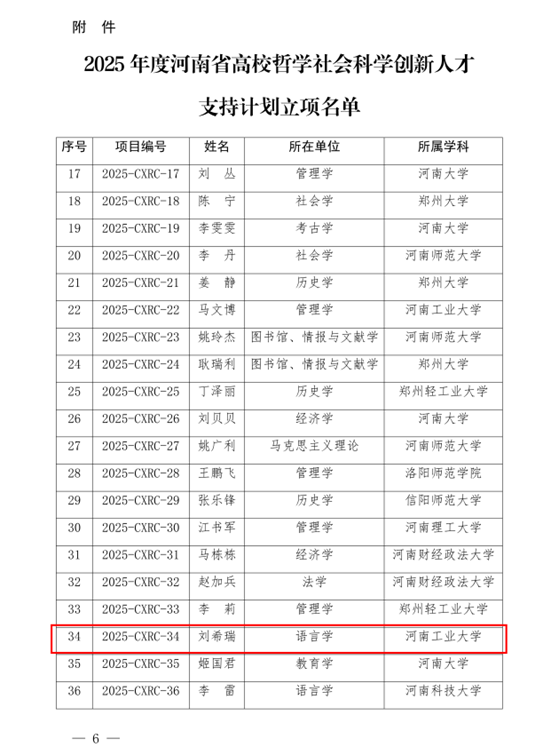 近日,河南省教育厅下发《关于公布2025年度河南省高校哲学社会科学创新人才支持计划立项名单的通知》(豫教工委〔2024〕227号)公布了2025年度河南省高校哲学社会科学创新人才支持计划立项名单。全省高校有39位教师入选2025年度河南省高校哲学社会科学创新人才支持计划,足球现场成绩