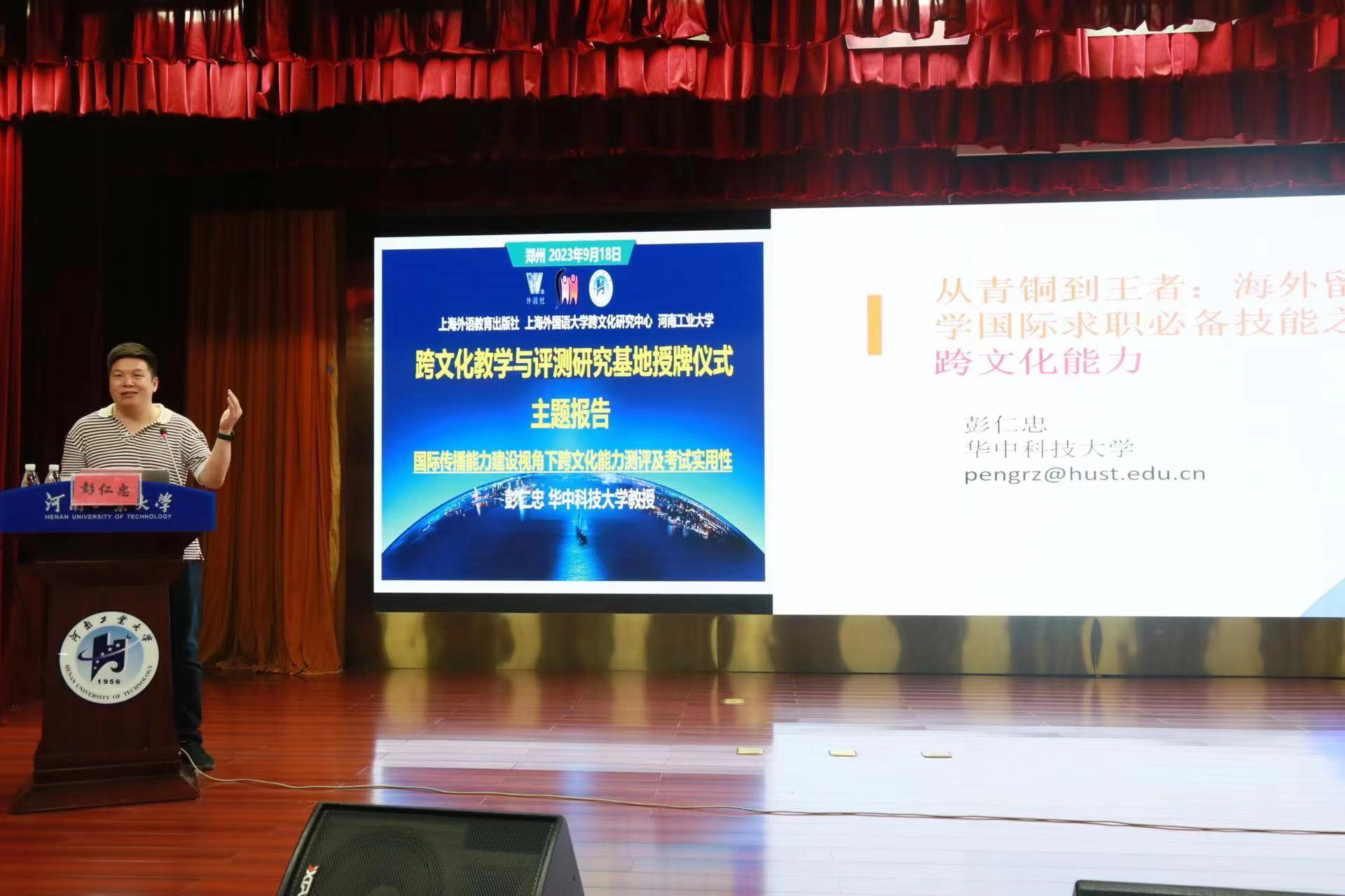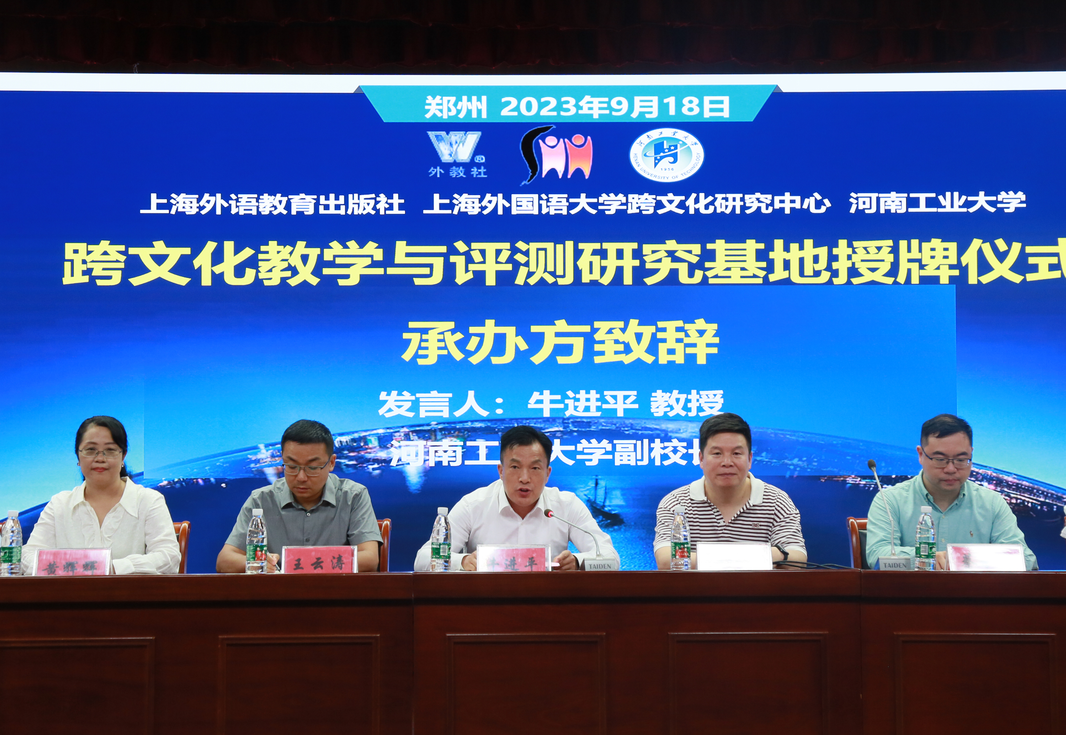 9月18日下午,由足球现场成绩 与上海外国语大学跨文化研究中心、上海外语教育出版社合作共建的跨文化能力研究与测评基地揭牌仪式在D303报告厅举行,河南工业大学副校长牛进平教授、华中科技大学彭仁忠教授、上海外语教育出版社河南教育发展中心蔡承浩主任、足球现场成绩 领导班子成员和师生代表200余人参加会议,会议由足球现场成绩 副院长葛丽萍主持。