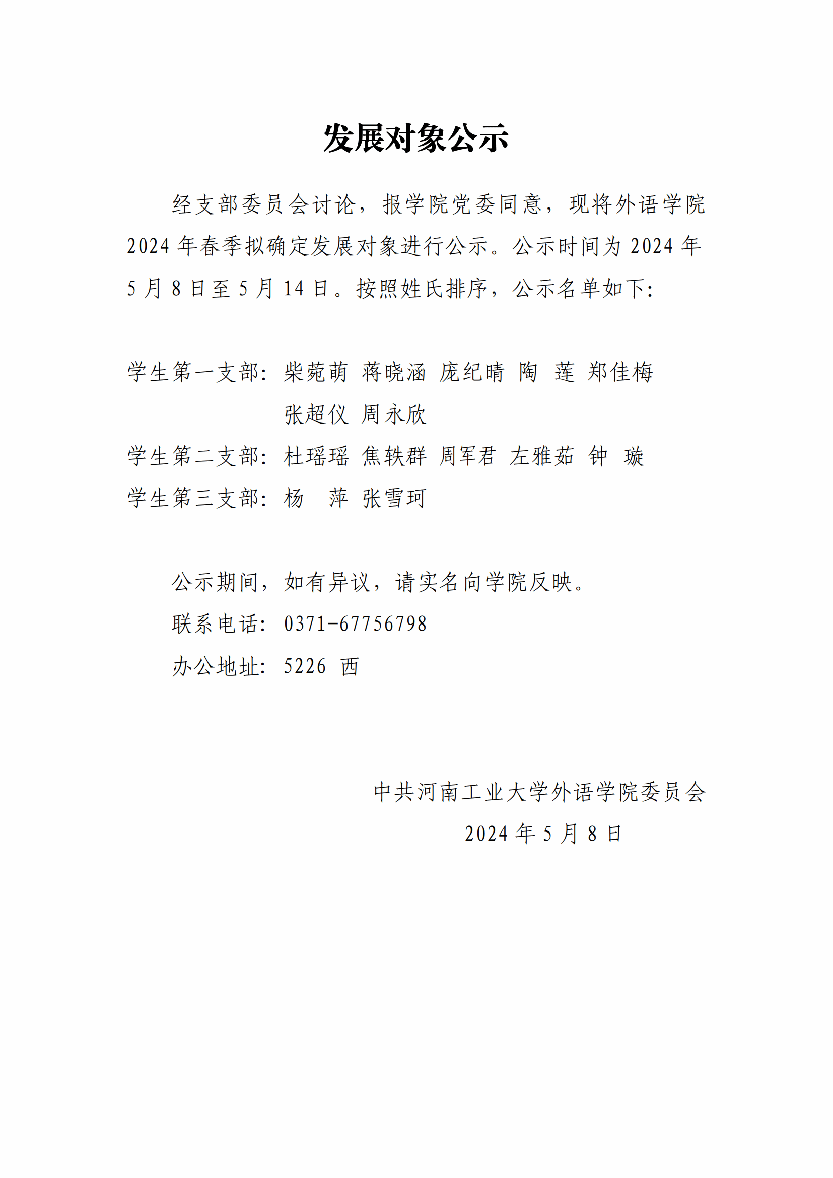 关于确定柴菀萌等14名同志为发展对象的公示