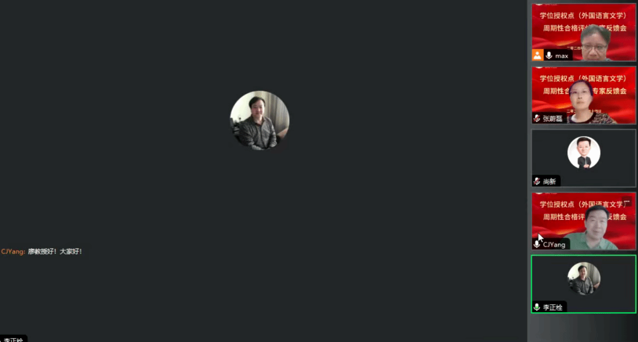 线上召开了外国语言文学硕士学位授权点周期性评估专家反馈会,会议由沈国荣副院长主持,硕士导师、英语系骨干教师等30余人参加了会议。