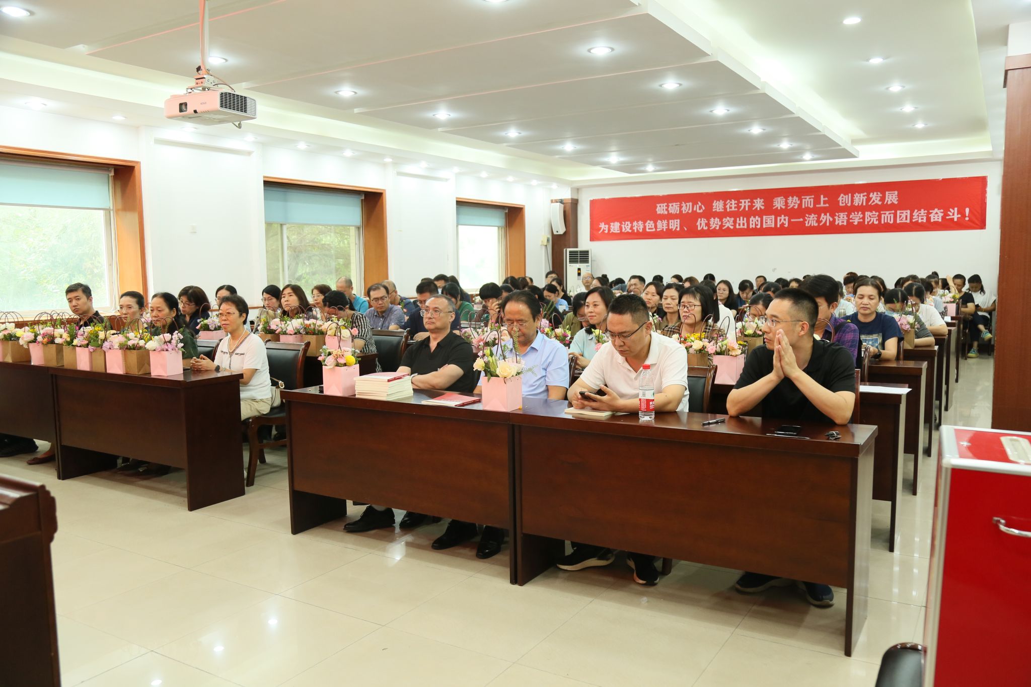 高质量发展作出的辛勤付出与无私奉献表示衷心感谢。他指出,教育决定未来,教师点燃希望。作为教育工作者,要自觉弘扬践行教育家精神,贯彻落实习近平总书记关于“四有好老师”“四个引路人”“四个相统一”“大先生”等重要论述,加强师德师风建设,注重教师职业发展,奋力推动学校高质量发展。一要葆有“大我”,坚定心有大我、至诚报国的理想信念,全面落实立德树人根本任务;二要葆有“大德”,陶冶言为士则、行为世范的道德情操,做“经师”和“人师”相统一的“大先生”;三要葆有“大智”,涵养启智润心、因材施教的育人智慧,让每个学生都有人生出彩的机会;四要葆有“大识”,秉持勤学笃行、求是创新的躬耕态度,成为终身学习的践行者;五要葆有“大爱”,勤修乐教爱生、甘于奉献的仁爱之心,用大爱书写教育人生;六要葆有“大道”,树立胸怀天下、以文化人的弘道追求,弘扬全人类共同价值。