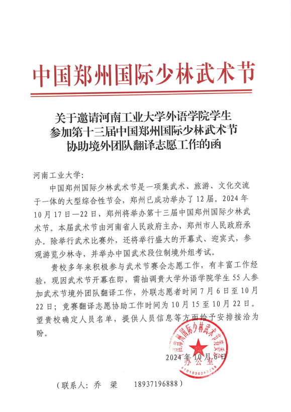 2024年10月17日至22日,第十三届郑州国际少林武术节暨中国郑州国际少林武术大赛在郑州举行。为了使广大外国朋友深入了解中国传统文化和赛事活动,帮助境外参赛团队和运动员顺利参与比赛,受郑州市体育局和第十三届郑州国际少林武术节筹委会邀请,外国语足球现场成绩