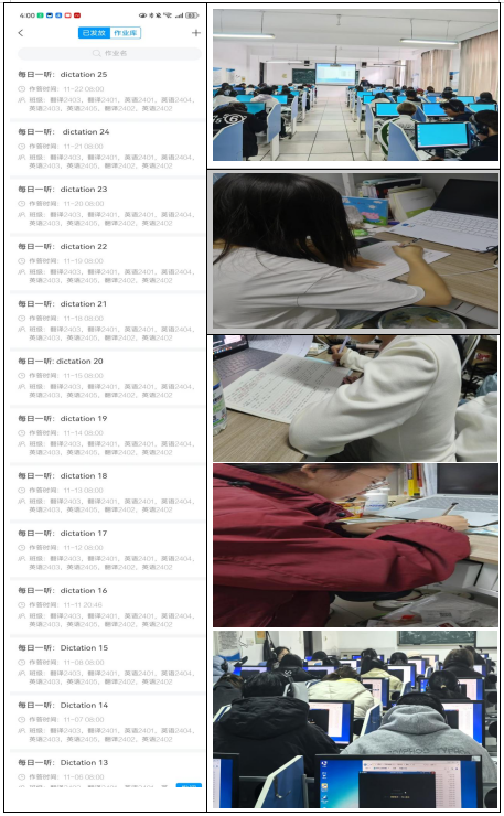 该活动依托《英语视听说(一)》和《英语视听说(二)》课程,贯穿4个学期。活动形式为从周一至周五在学习通上每日发布一则英语听力音视频,形式多样,内容丰富。听力素材涵盖原版英语新闻、英语小说、英语电视电影等片段,同时还包括部分大学英语四、六级、专业四级、八级听力试题,以及托福和雅思听力试题。学生的考勤与训练成绩将计入《英语视听说(一)》和《英语视听说(二)》的过程性评价。