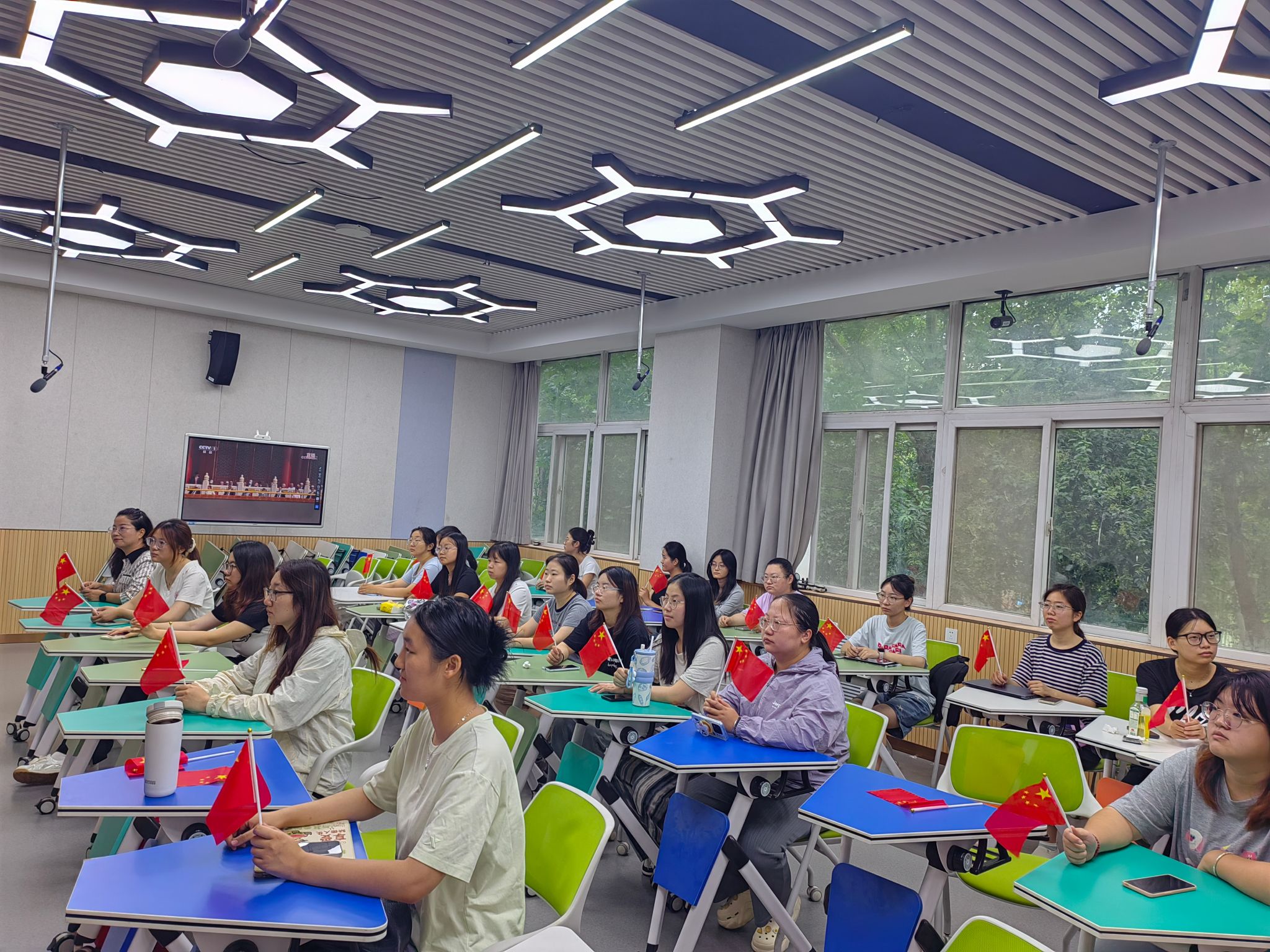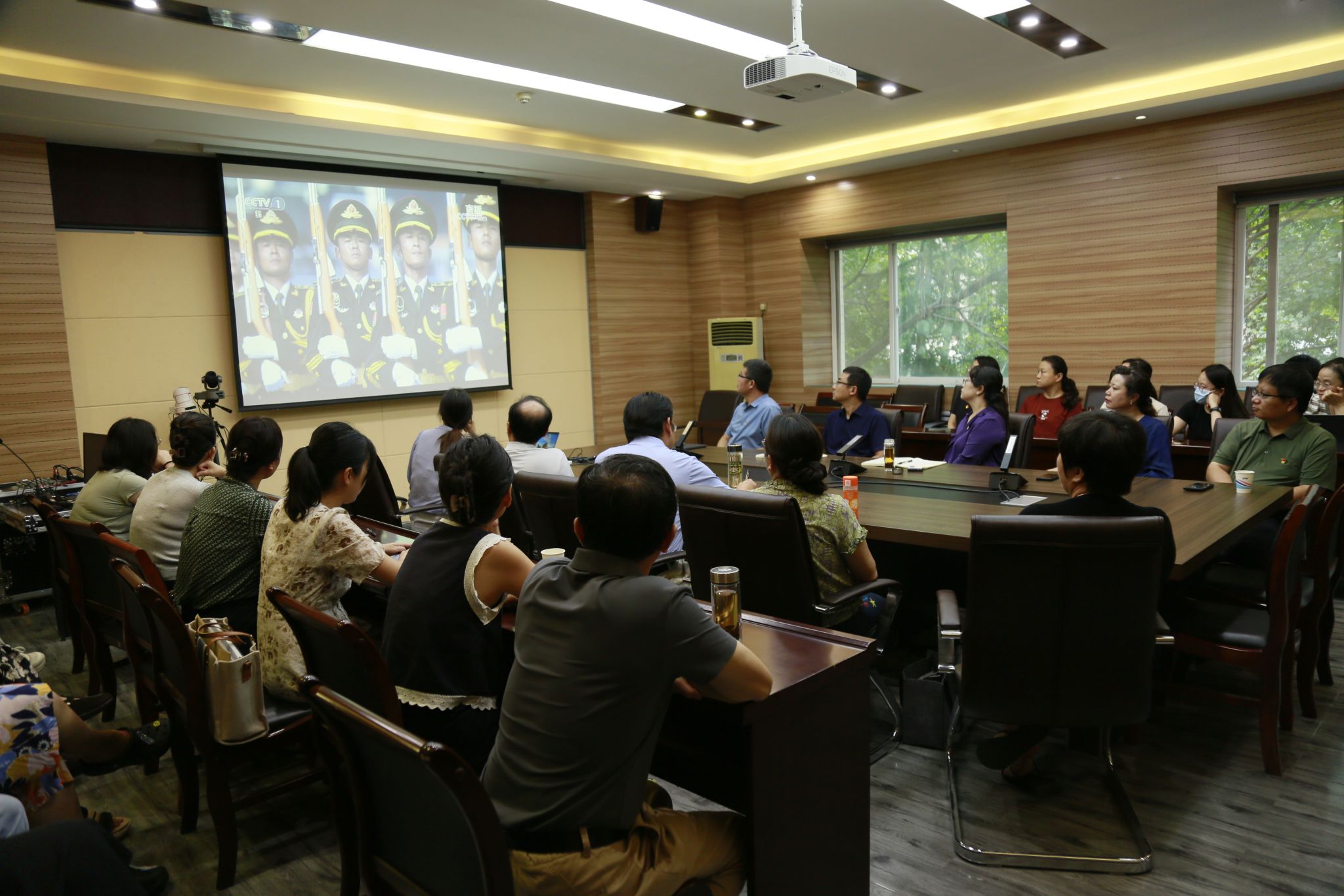 组织全体师生分别在各会议室和教室集中观看纪念中国人民抗日战争暨世界反法西斯战争胜利 80 周年大会直播。