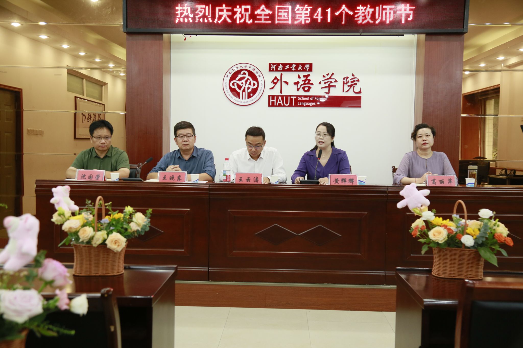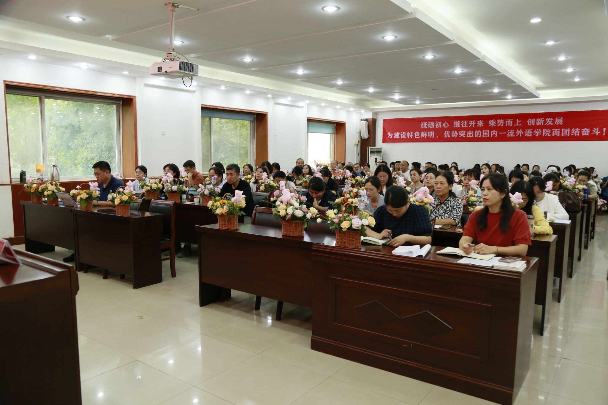 领导班子与全体教职工参会,会议由院长黄辉辉主持。