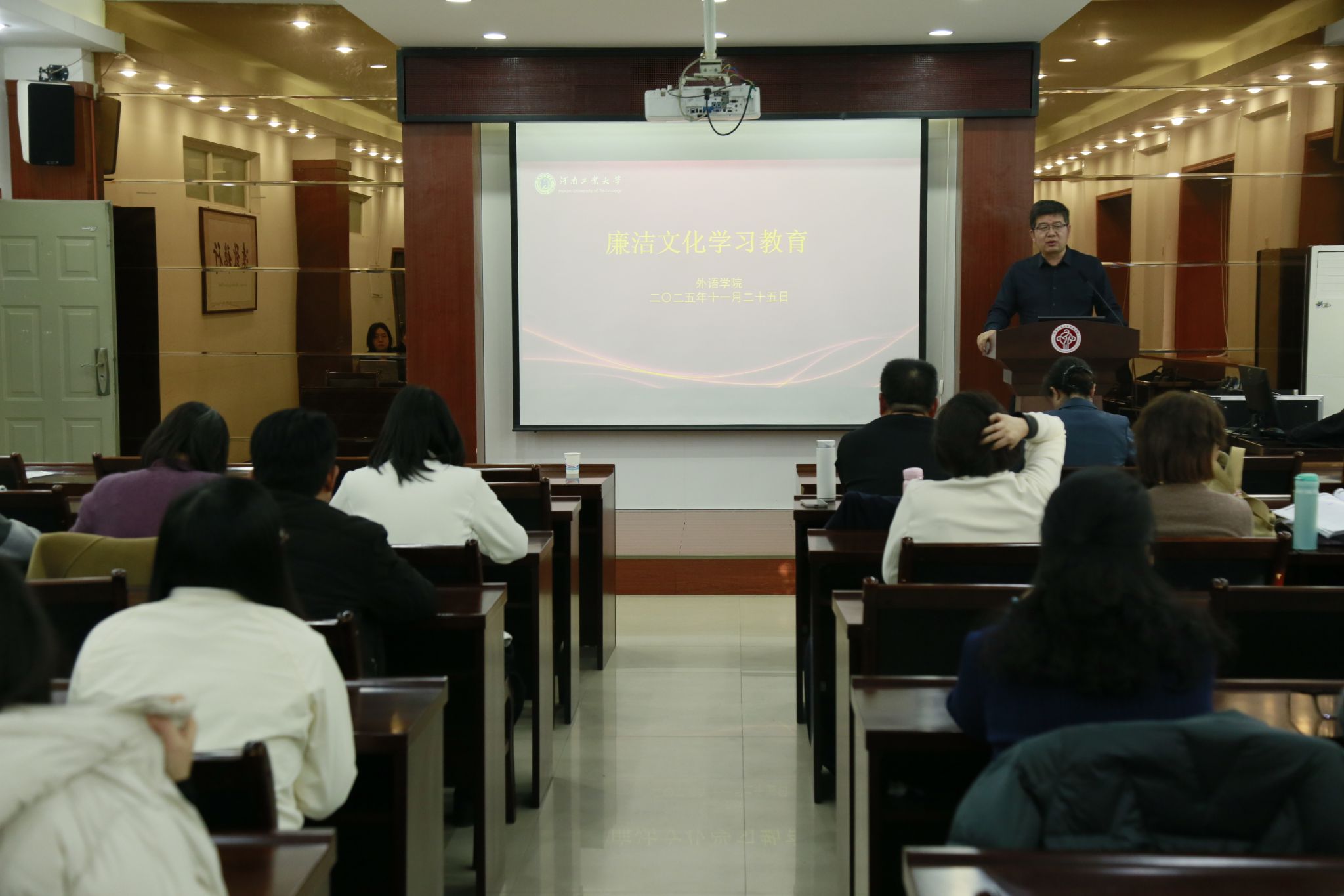 在5225会议室召开全体教职工大会,专题开展廉洁文化学习教育。全体教职工参会,会议由院党委书记王云涛主持。