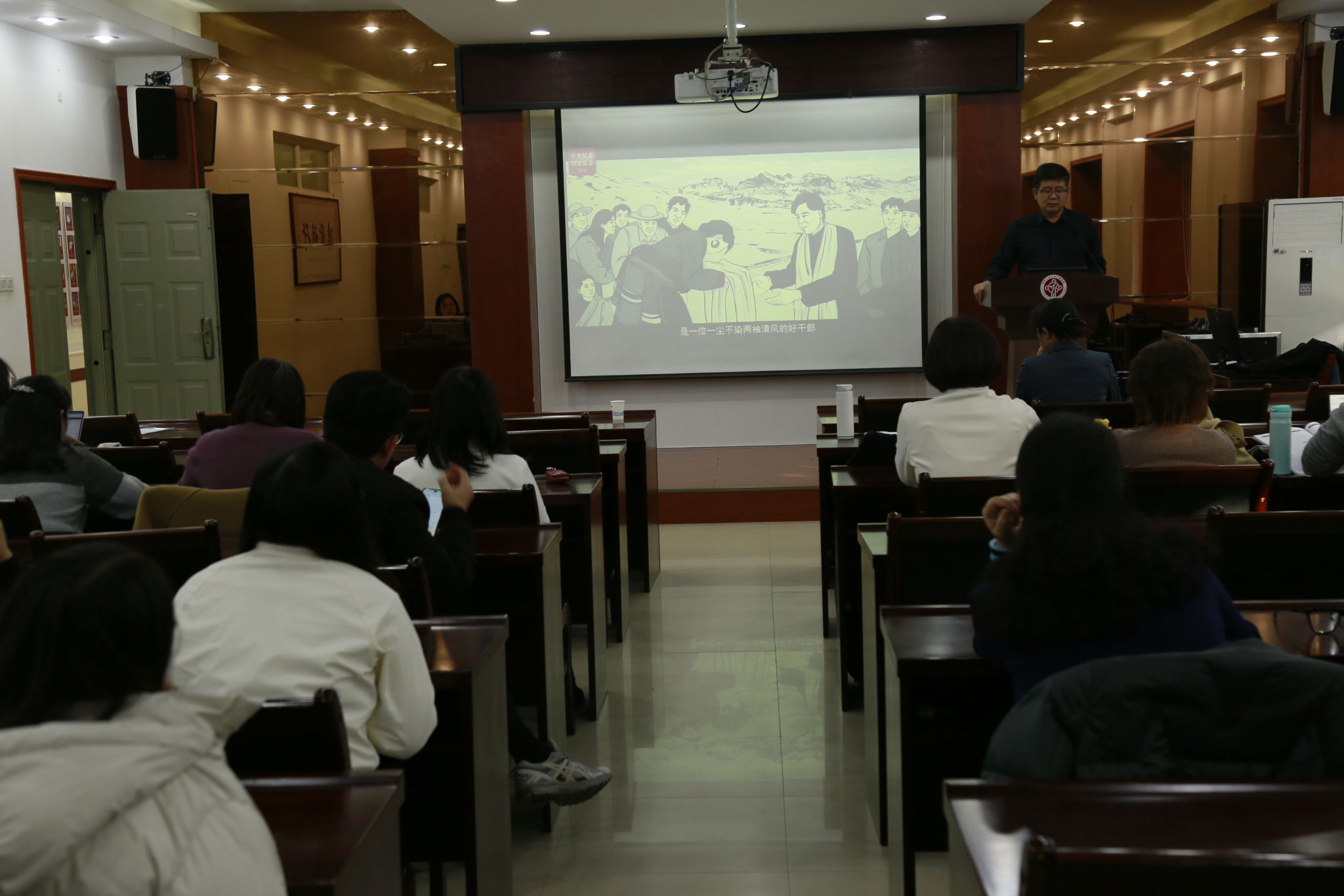 警示教育环节,全体教职工集中观看了三组主题鲜明的廉洁视频。《清廉中国・学史鉴廉丨孔繁森:做实事 做好事》通过真实史料和生动叙事,展现了孔繁森廉洁奉公、一心为民的崇高风范,其仅留8元6角遗产与12条发展建议的遗物故事,让在场教职工深受触动。随后播放的《警钟 | 家风失守 坠入迷途》《警钟 | 防线就是这样一步步被突破》两部警示视频,通过典型违纪违法案例,还原了部分干部从思想松懈到防线失守、从家风不正到身陷囹圄的堕落轨迹,深刻揭示了“小节不守、大节难保”的惨痛教训,以“身边事”警醒“身边人”。