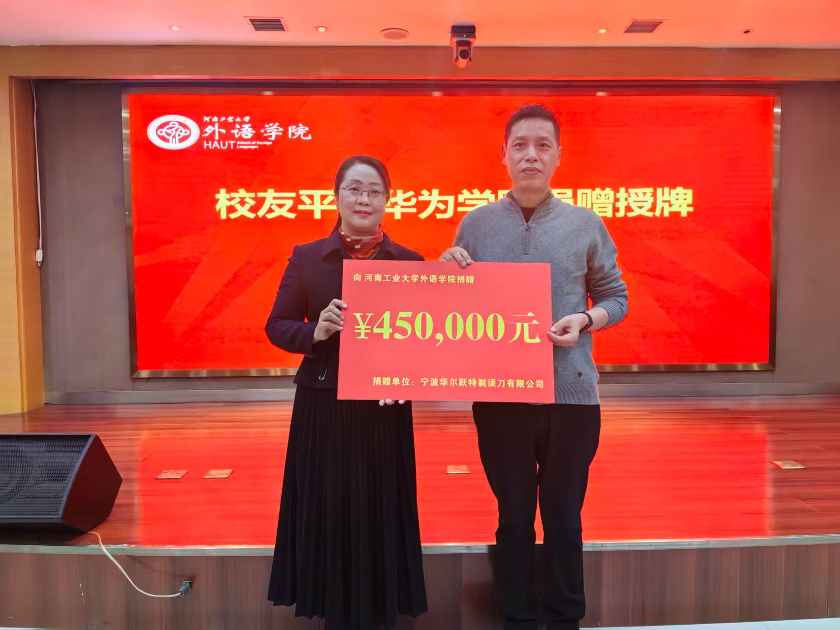 1999级校友、宁波华尔跃特剃须刀有限公司创始人平锦华致辞,他深情回忆了校园往事,以及个人创业与企业发展的历程。他表示,母校不仅给予自己专业知识,还有面对世界的底气,设立奖助学金和奖教金既是对母校培育之恩的真情回馈,也是企业践行社会责任的具体行动,希望奖助学金不仅是物质支持,更是一种精神的延续,期待获奖同学未来积极回馈社会,让这份温暖持续传递。