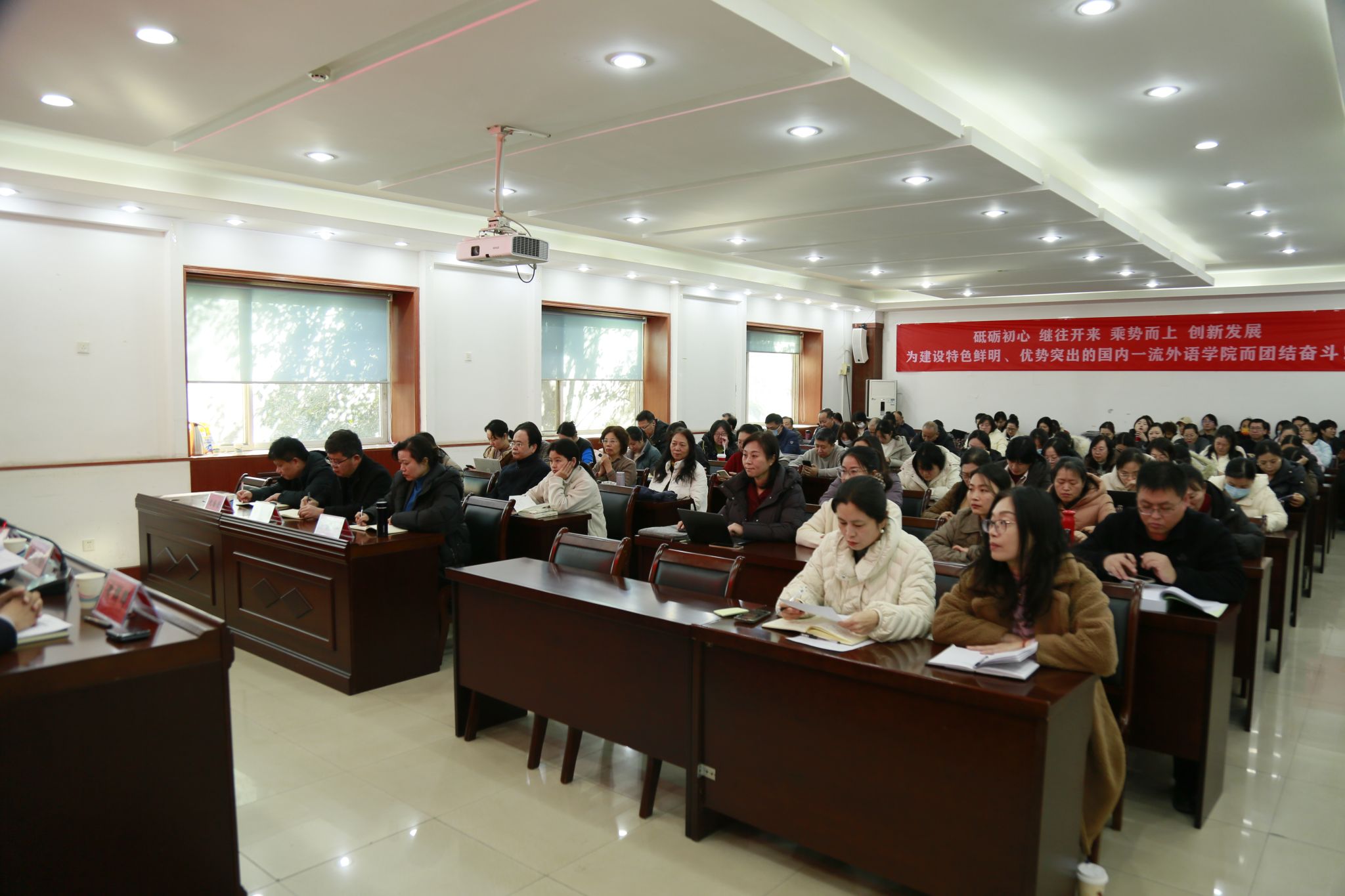 凝心聚力、真抓实干,各项事业实现跨越式发展:学科与专业排名稳步提升,英语、翻译专业跻身全省前列;师资队伍建设成果显著,教师在国家级、省级教学竞赛中屡获佳绩;课程建设实现突破,成功获批省优质国际化课程,填补相关领域空白;科研创新能级大幅提升,年度获批国家社科基金项目数量创历史新高,其中中华学术外译项目实现学校该类项目零的突破,著作出版、论文发表及科研经费均创新高;人才培养质量持续提升,本科生升学率位居全校文科足球现场成绩