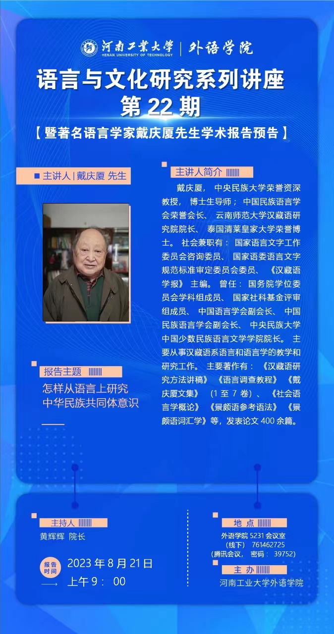 语言与文化研究系列讲座第22期暨著名语言学家戴庆厦先生学术报告预告