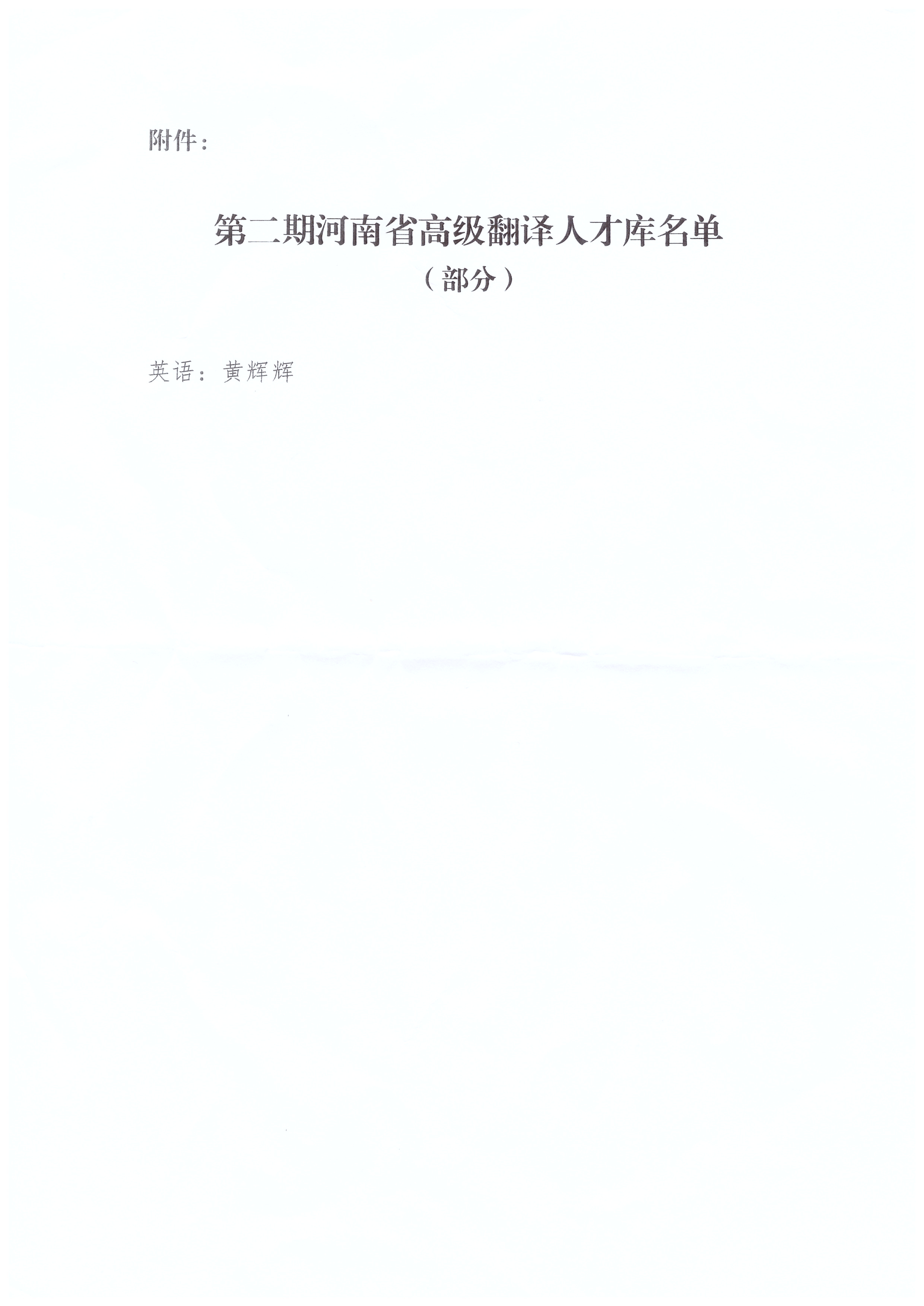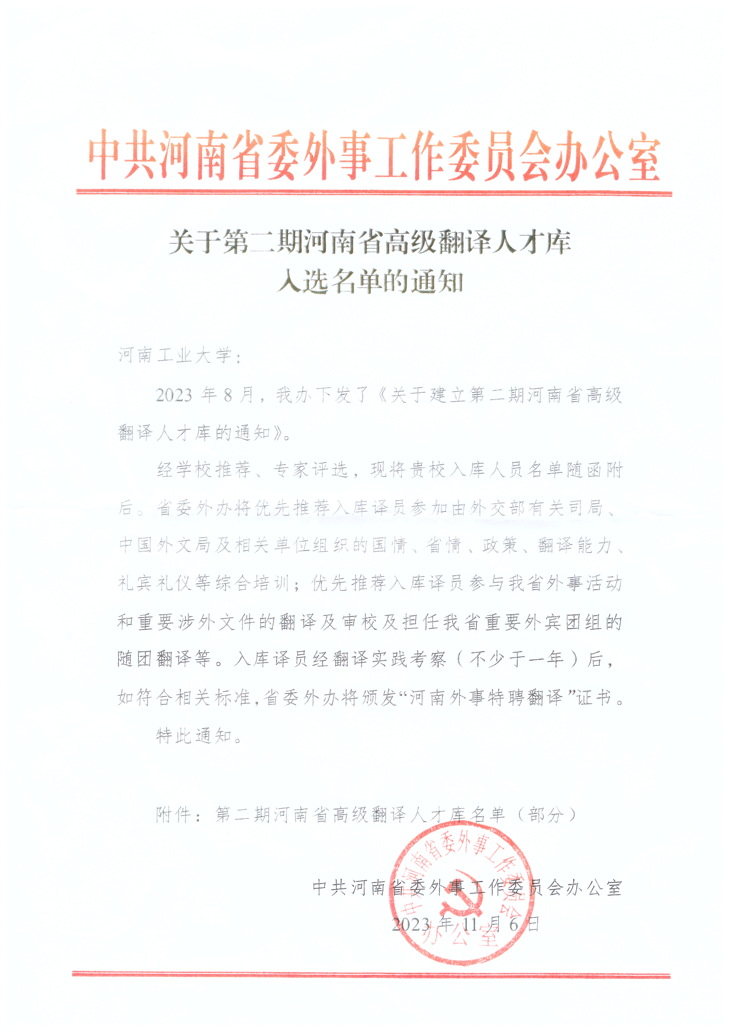 2023年8月,中共河南省委外事工作委员会办公室启动第二期河南省高级翻译人才库遴选工作。经省内各高校推荐、中共河南省委外事工作委员会组织专家评选,共25名专家入选,其中英语语种7人,俄语、德语、法语、西班牙语、日语等其他语种18人。