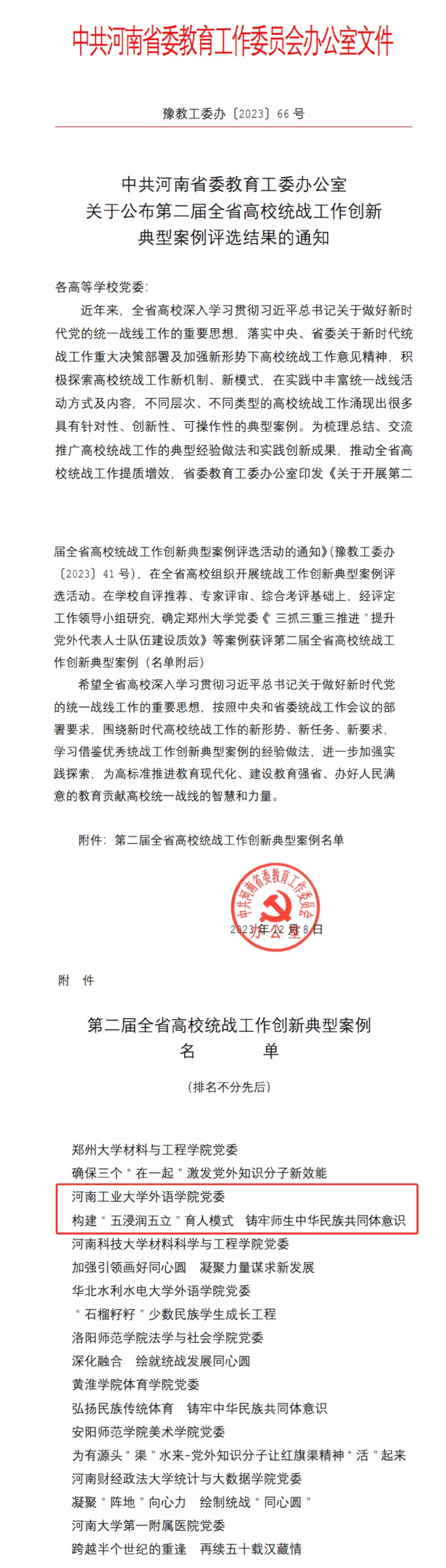 近日,中共河南省委教育工委办公室下发《关于公布第二届全省高校统战工作创新典型案例评选结果的通知》(豫教工委办〔2023〕66号),今晚球赛成绩