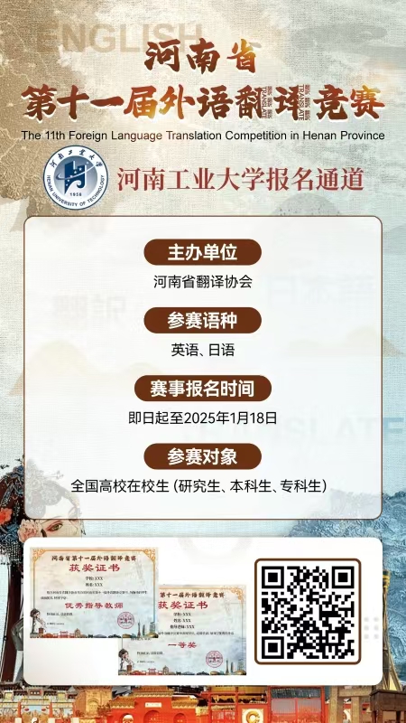 翻译是文化交流的桥梁,是信息沟通的纽带,是国家文化软实力和国际传播能力的重要组成部分,翻译工作对于提升中华文化的国际影响力和话语权具有重要作用。为加强河南省在国际交流和合作中的地位和影响力,河南省翻译协会决定举办河南省第十一届外语翻译竞赛,欢迎全国大学生踊跃报名参赛。
