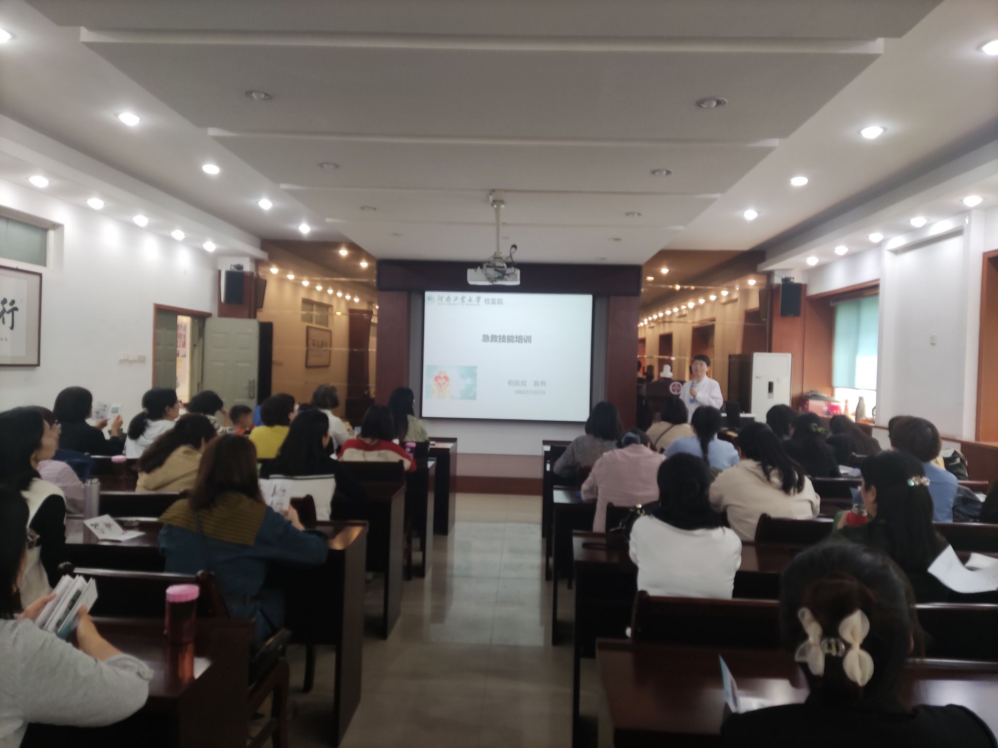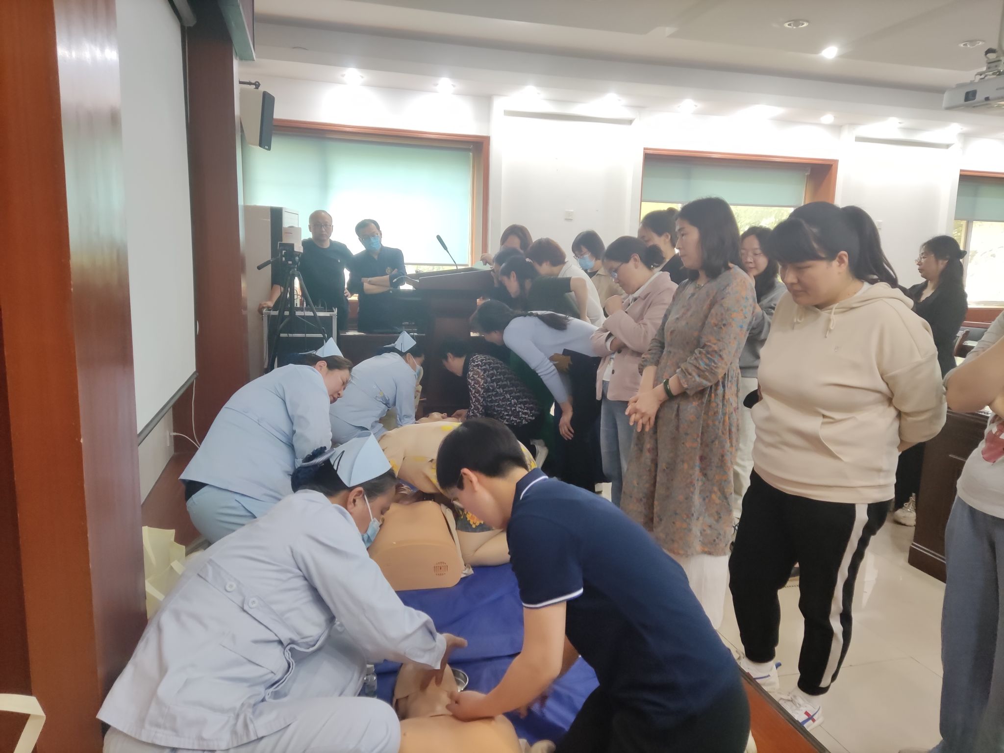 培训环节,授课老师重点围绕心肺复苏、外伤、烫伤、气管异物、卒中急救等内容开展培训。结合生活中的真实案例,详细讲解了在急救处置中的注意事项和操作要点,并通过视频学习了心肺复苏术的操作要点及海姆力克急救方法。随后,陈辉通过“模拟人”现场演示心肺复苏的操作流程,从观察救护环境、判断意识心跳,到胸外按压、人工呼吸耐心地为学员们讲解原理、演示各个步骤,细致地说明胸外心脏按压和人工呼吸的注意事项。参训教职工在陈辉和医护人员的专业指导下,现场进行实操训练,掌握心肺复苏术操作要点。