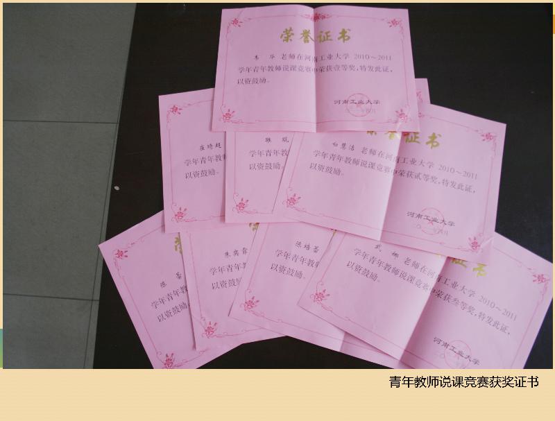 拥有“河南省教育厅学术技术带头人”3人,“河南省教育系统优秀教师”2人,“河南省教学标兵”9人,校研究生“良师益友”1人,校 “十佳师德标兵”2人,教师中先后有15人次获省级教学大奖赛一、二等奖,27人次获校教学大奖赛一、二等奖。