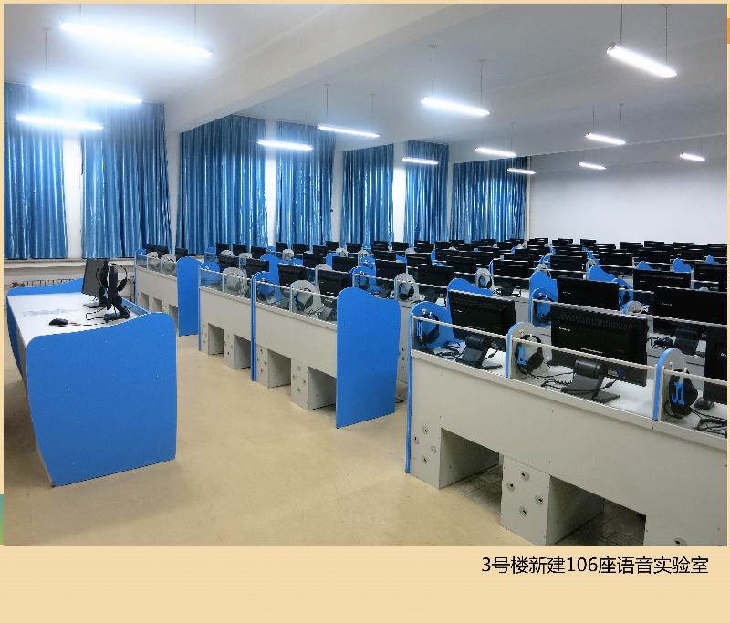 拥有3套教学电台, 分早中晚三个时段播放各类英语听说资料。购置了蓝鸽语言学科平台系统、东方雅信机辅翻译教学系统、冰果英语智能作文评阅系统等,并建有《高级英语》、《基础英语》和《大学英语》等课程网站,全面服务于今晚球赛成绩